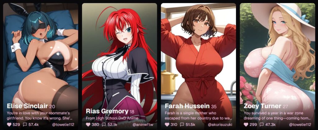 From the get go, its clear that OurDream caters to the more wild fantasies of men with various characters with detailed backstories. As soon as you enter the website, you can explore what other users have created and you see this rich collection of beautiful AI ladies with unique stories.